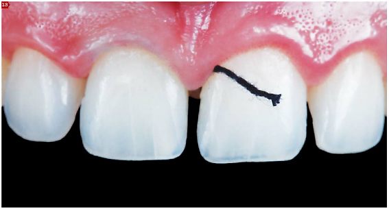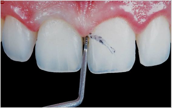 A inserção do fio retrator deve ser realizada sutilmente, em direção apical, com inclinação de 45 graus [Figuras 11 e 12]. O uso de anestesia é indicado para evitar dor durante a inserção do fio, bem como para controlar a salivação do paciente. Desta forma, haverá melhor aproveitamento da capacidade de retração das soluções utilizadas. Como o fio deve ser mantido em posição durante alguns minutos e o campo operatório deve ser mantido seco, é necessário umedecer o fio antes de removê-Io, evitando lesões ao tecido gengival devido à aderência do fio ao epitélio sulcular [Figura 2].