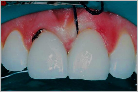 Figuras 1 a 4 – Inserção de fio afastador durante a fase de moldagem, para controlar a umidade intrasulcular e afastar lateralmente o tecido gengival; e durante a cimentação, para prevenir a entrada de agente cimentante no interior do sulco. Observar a remoção do fio úmido para não Iacerar o tecido gengival.