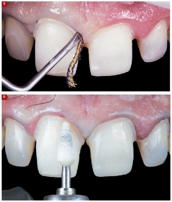Figuras 5 e 6 – Inserção de fio afastador durante a fase de acabamento do preparo coronário, que previne a Iaceração acidental da parede sulcular com broca.