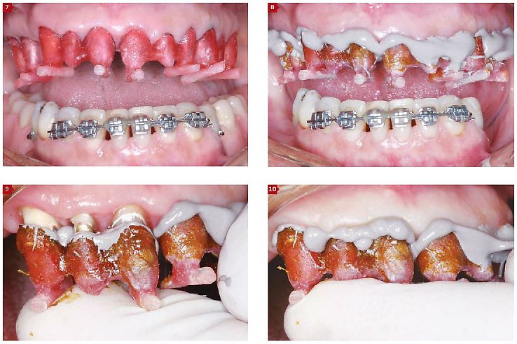 Figuras 7 a 10 – Sequência de moldagem por meio de casquete de resina acrílica e mercaptana, ilustrando a fase de prova dos casquetes até a compressão final, onde é possível visualizar a isquemia e o respectivo afastamento atraumático tecidual.