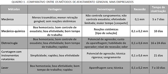 O afastamento gengival pode ser realizado de distintas maneiras, as quais estão inseridas dentro de três principais categorias: métodos mecânicos, métodos químico-mecânicos e métodos cirúrgicos. A técnica químico-mecânica é a mais utilizada e consiste no afastamento mecânico da gengiva através da colocação de fios trançados, entrelaçados ou tricotados, embebidos em soluções químicas que propiciam a vasoconstricção, promovendo o controle do fluido gengival e hemostasia temporária [Quadro 1].