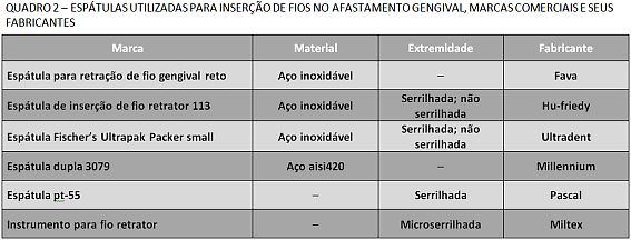 Este procedimento é realizado com o auxílio de instrumentos desenvolvidos especificamente para esta finalidade. As espátulas para a inserção de fios retratores podem ter a extremidade circular não serrilhada ou serrilhada. A primeira é indicada para a inserção de fios retratores torcidos ou entrelaçados, e facilita a inserção do fio com movimento deslizante em direção ao interior do sulco gengival. As espátulas com extremidade circular serrilhada são indicadas para auxiliar na colocação dos fios tricotados, pois a serrilha penetra no fio tricotado e auxilia na colocação do mesmo, além de evitar que a espátula escorregue e cause danos ao tecido gengival [Quadro 2].