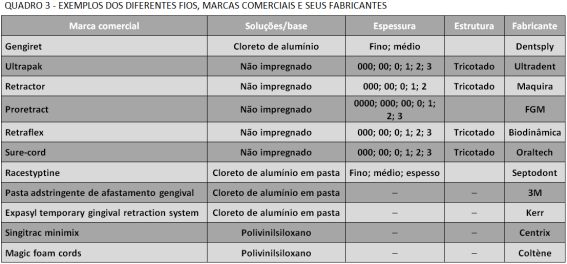 Os materiais podem ser classificados em três grupos, baseados no método de aplicação: agentes hemostáticos, fios retratores, pastas e géis retratores [Quadro 3].