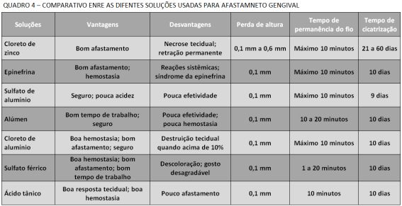 O ácido tânico de 20% a 100% também pode ser utilizado como agente químico para o afastamento gengival. Ele não causa efeitos sistêmicos e irritação tecidual, porém, oferece pouca hemostasia e efetividade25 [Quadros 4 e 5].