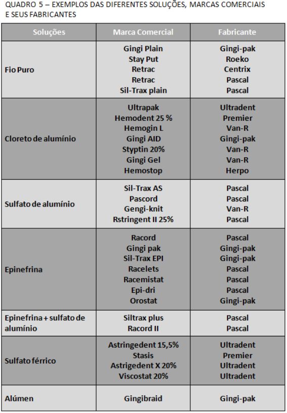 Uma das soluções hemostáticas mais empregadas é o cloreto de alumínio. Esta solução é utilizada juntamente com fios não impregnados, e está presente em alguns fios impregnados e nas pastas afastadoras. Ela promove boa hemostasia, afastamento eficiente e é considerada segura por não apresentar efeitos colaterais23.