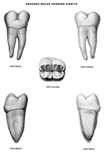 Segundo molar apresenta quatro cúspides, com sulco principal em forma de X;
