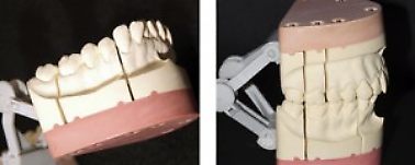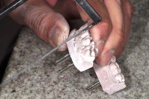 Após a secagem, o modelo é recortado de uma forma que permita além de uma melhor manipulação do elemento a ser trabalhado, a articulação do modelo.