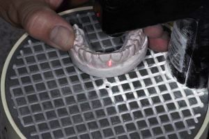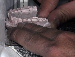 Neste momento o técnico precisa ser fidedigno à anatomia buscando um corte nos lados mesial e distal do dente preparado, deixando ainda um ponto de contato para que o troquel seja exatamente igual ao modelo do paciente.