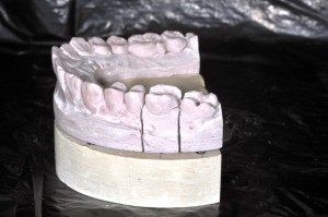 Feito isto, o técnico delimita a área a ser troquelizada de forma que os elementos sejam seccionados mantendo o desenho original da arcada do paciente (é neste momento que um profissional competente entra). Muitos profissionais acham que troquelizar um modelo é apenas cortá-lo, mas não. Caso esta secção seja feita de maneira errada, toda a anatomia da arcada do paciente muda, prejudicando assim a adaptação do trabalho.